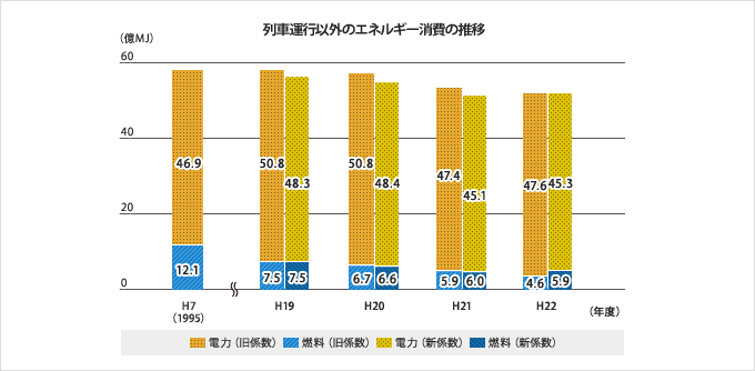 さまざまな列車運行エネルギーの低減努力によって、平成22年度の車両キロあたりの消費エネルギー(1両を1キロメートル走行させるのに必要なエネルギー)は22.1メガジュールと、当社基準年の平成7年度に比較して11.2%削減しています。