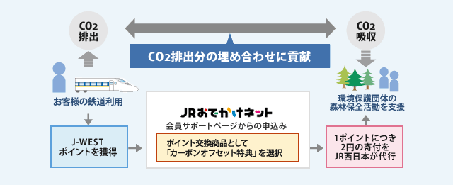 J-WESTカード(当社が発行するクレジットカード)決済や、スマートICOCAでの当社エリアの鉄道利用等で貯まるJ-WESTポイントを、森林保全等を行う環境保護団体への寄付金に交換、寄付手続きを当社が代行する「カーボンオフセット特典」を実施しています。鉄道利用によるCO2排出分の埋め合わせへの貢献に当社とともに手軽にご参画いただくもので、平成20年度より取り組んでいます。