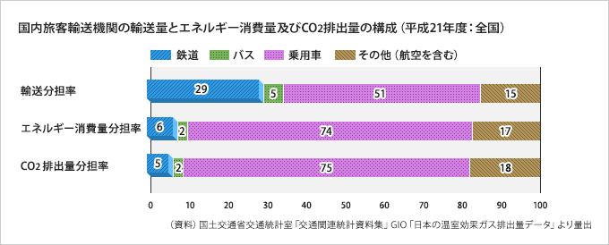 鉄道は日本の旅客輸送の約3割を担っていますが、エネルギー消費量は約6%、CO2排出量は約5%であり、わずかなエネルギーやCO2排出で多くのお客様にご利用いただいています。