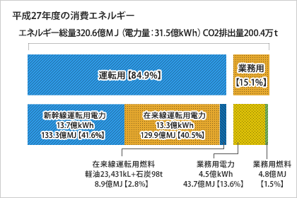 平成27年度にJR西日本が消費したエネルギー総量は320.6億メガジュールであり、そのうち95.5%は電力が占めています。