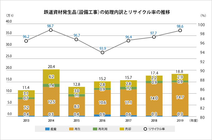 鉄道の安全運行を確保するための設備の保守や工事での発生品は、受託工事を含め2019年度は設備工事で18.8万トン、車両で1.7万トンでした。