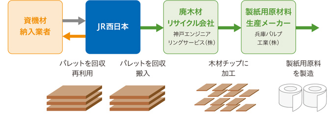 鉄道事業で使用する資機材の取引先様に対しては、事業活動において地球環境保護に努めることや、当社が定める「グリーン調達ガイドライン」への協力を求めています。また、サプライチェーンに加え、地域の事業者様と連携した取り組みとして、鉄道事業に必要な資機材の運搬に使用した木製パレットのリユースや、パルプ生産の原料としてリサイクルすることにも取り組み、資源の有効活用とコスト削減を同時に実現しています。