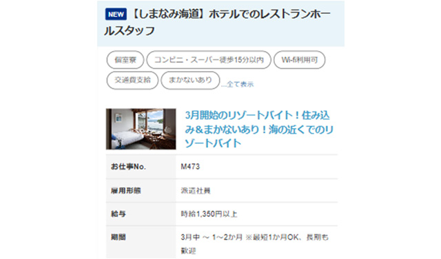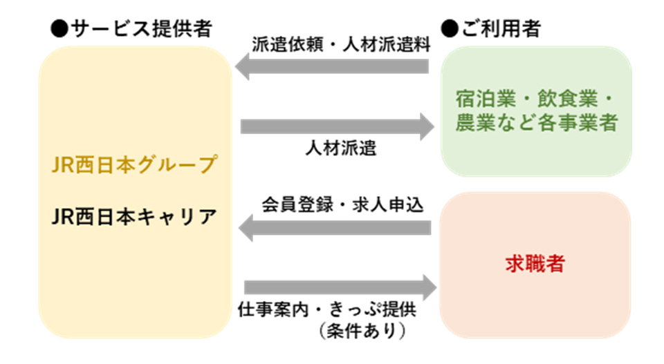「繁忙期の時だけ人手が欲しい」「働きたい人が地域に少なく、求人をかけても人が集まらない」というお悩みをお持ちの事業者さまと、普段の生活圏を飛び出して仕事がしてみたい求職者の皆様をつなぐ人材マッチングサービス(主に人材派遣)です。
