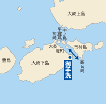 | 潮待ちの港として自然の地形に恵まれた御手洗の港は、潮の流れが満潮時には北側に、干潮時には南側に流れる。 |