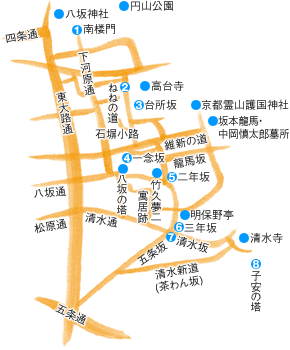 5.二年坂は勾配のゆるい15段ほどの坂。竹久夢二とその恋人彦乃が毎日のように通ったという、甘味処老舗・かさぎ屋があり、大正ロマンを漂わせる。 |