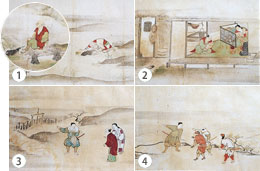 | (1)おじいさんは山へ柴刈りに、おばあさんは川へ洗濯に…この場面では老齢に見えるが(2)の桃太郎が生まれた場面では、2人は若返っている。(3)強く立派に成長した桃太郎が、鬼ケ島へ鬼征伐に出発する場面。(4)イヌ、キジ、サルの供が揃い、めざすは鬼ケ島。 |