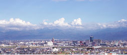 | 呉羽山山頂から富山市街を望む。街の背後に3,000m級の立山連峰が聳える。 |