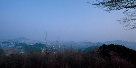 東の空が白みはじめると、大和盆地を覆っていた闇がとけはじめ、乳白色の朝霧の海原に浮かぶ島々のように、畝傍山[うねびやま]、耳成山[みみなしやま]、香具山[かぐやま]の大和三山が姿を現す。古代のままの静謐な風景が、夜明けとともに目の前にひろがっていくが、麓の集落はまだ明けやらぬ闇の中で静かに眠っている。