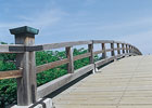 橋の欄干の下部と橋板の間には隙間をつくって、雨水が溜まらない工夫を施し、木が腐朽するのを防いでいる。 |