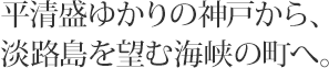 今回の旅の終着点である加古川駅までは神戸から快速電車で40分あまりだが、沿線の美しい海岸線とともに、清盛や平家の夢の跡を辿る旅でもあった。