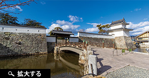 赤穂城三之丸大手門。1661(寛文元)年築城の赤穂城は変形輪郭式の海岸平城で、海に臨んだ城の東西の浜には塩田が広々と続いていた。