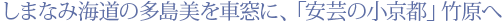 三原城跡に隣接する三原駅を離れた列車はすぐに山陽本線と分岐し、進路を南に沼田川を渡る。筆影山[ふでかげやま]の裾野を走る列車が隣の須波[すなみ]駅に近づくと、車窓から瀬戸内海に浮かぶ大小さまざまな島々が見えてくる。最初の絶景だ。間近に見えるのは小佐木[こさぎ]島や佐木島、その奥には島影が重なるように見える。広島県尾道市と愛媛県今治市を結ぶ「しまなみ海道」の風景だ。