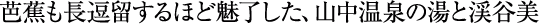 湯だけでなく、山中温泉の自然の豊かさも芭蕉は気に入ったようだ。小さな温泉街の三方は山に囲まれ、町に沿って流れる大聖寺川[だいしょうじがわ]の渓谷、鶴仙渓[かくせんけい]の美しさは北陸随一といわれている。渓谷の遊歩道は、周囲の山々もさることながら、苔に覆われた斜面や丁寧に敷かれた石の階段が美しく、歩くほどに清々しい気持ちにさせてくれる。