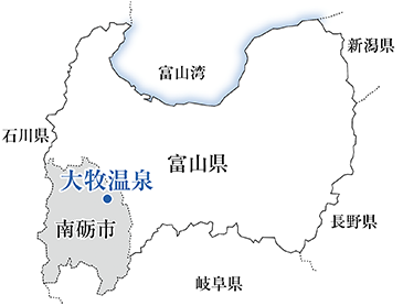 富山県の南西部にある南砺市は、散居村で知られる砺波平野と、世界文化遺産「五箇山合掌造り集落」を有する山間部からなる。大牧温泉は、その五箇山を上流とする庄川の河畔の一軒宿。日常から離れ、静かな自然環境を求める人々が、遊覧船に乗って訪れている。