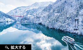 大牧温泉への交通手段は小牧港から就航する遊覧船のみ。冬季には、降り積もった雪景色の峡谷を進む約30分の船旅が、日常から非日常へと誘う。