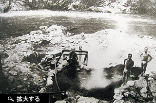 ダム建設前、湯治場として人気のあった河原の露天風呂。庄川では江戸時代以前から、飛騨・五箇山地方の山奥で伐り出した木材を全国で売るために「木材流送」が行われていた。