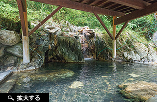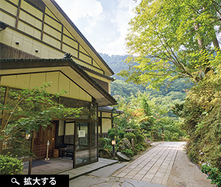 川面に迫り出すように造られた旅館は、まさに秘境の中にたった一棟佇んでいる。部屋数は30室。かつては部屋から釣り糸を垂らし、川魚釣りを楽しむという風流な光景もあった。川底から引き上げる温泉は約58℃。塩化物泉と硫酸塩泉の混合泉で、現在も毎分350リットルが湧き出ており、余った湯は川に戻すという。塩化物泉は温まると冷めにくく、擦り傷、冷え性、皮膚病、胃腸病などに効果が期待される。敷地内には内湯と露天風呂の6つのタイプが点在。露天風呂は階段を登っていき、川を見下ろすような場所にあり、男女で趣が異なる。新緑、紅葉、雪景色と四季折々の自然に包まれる中で、特に夏には、対岸の急峻な森を歩くカモシカの親子の姿を見られ、暑い日の夕方には川面に霧が立ち込めることもある。秘境の夜を堪能できるように、夜9時には消灯。せせらぎをBGMにゆったりと眠りにつくことができる。