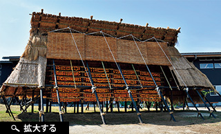 現在は機械による乾燥だが、かつては「ハサ掛け」といい、竹竿に吊して天日で柿を干す光景が晩秋の里山の風物詩だった。現在は観光用と風景継承を目的に1カ所で復活させている。