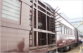 高架下の条件に関わらず、電柱の建て替えが可能な保守用車です。電柱に取り付いている部分の仮支持を行う支持装置、建て替えを行うクレーン装置、スムーズな取卸が可能な柱の運搬装置が1編成で出来るように集約されていることが特徴です。