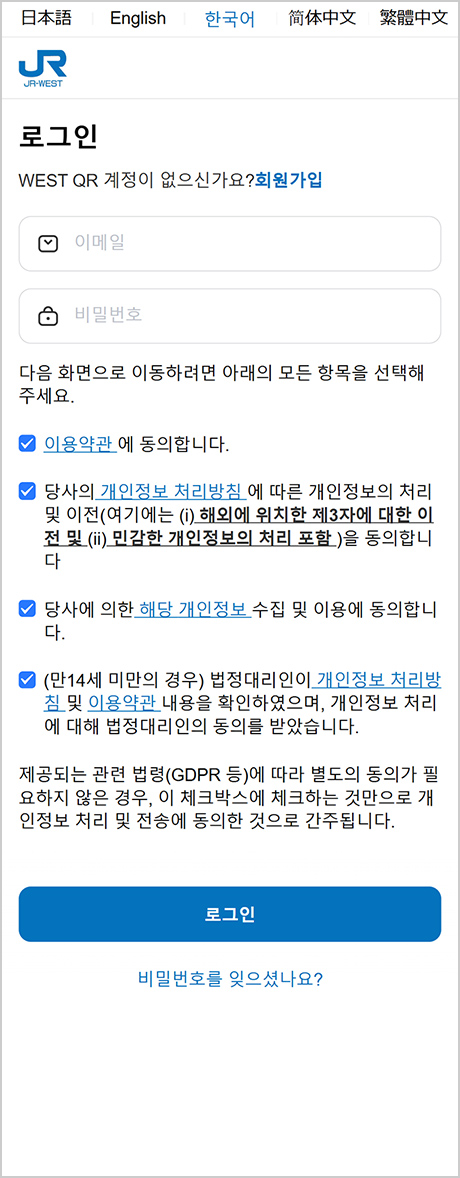 WEST QR 바우처에 있는 링크를 통해 사이트에 접속한 후 아래 단계에 따라 회원가입을 진행해 주세요. 티켓 등록을 완료한 후에는 로그아웃하고 로그인 화면을 북마크에 추가하는 것이 좋습니다.