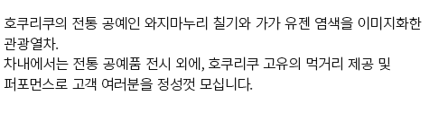 1호차 입구는 와지마누리 칠기의 전통적인 도안과 가나자와 금박을 사용한 '전통' 디자인으로 꾸몄습니다. 전통 공예품 전시 공간도 마찬가지로 가나자와 금박으로 장식했으며 노선 주변 지역의 전통 공예 작품을 전시합니다.