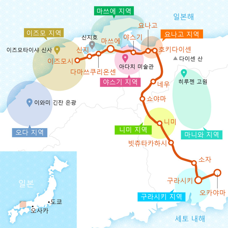 YAKUMO는 서일본여객철도주식회사(JR 서일본)에서 운영하는 특급 열차 서비스입니다. 신칸센 노선상의 한 역인 오카야마역에서 출발하는 이 열차는 바다와 접한 산인 지역의 주요 도시인 요나고와 마쓰에를 거쳐 국내외 여행객 사이에서 유명한 행선지인 이즈모타이샤 신사가 있는 이즈모(이즈모시역)까지 운행됩니다. YAKUMO 열차의 독특한 브론즈 색상 외관은 해당 지역의 역사와 문화에 영감을 받아 만들어졌습니다. 승차감에 중점을 두고 승객이 "집에 있는 것처럼 편히 쉴 수 있도록" 차량을 설계했습니다. 새로운 YAKUMO 열차는 그리운 옛 일본 풍경이 아직 남아 있는 곳으로 여행객을 실어나르는 역할을 수행합니다.
