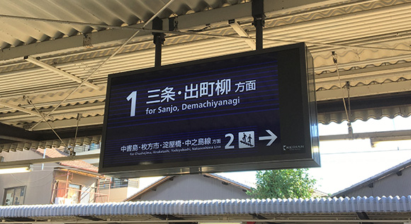 请从1号站台(三条、出町柳方向)上车。前往京阪“祇园四条站”。