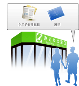 請於JR窗口(綠色窗口)出示「護照」、「記載預約申請完成的郵件影本」。
