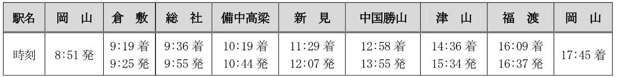 ※注釈:乗車は岡山駅・倉敷駅、降車は岡山駅のみとなります。途中駅(総社駅、備中高梁駅、新見駅、中国勝山駅、津山駅、福渡駅)では立ち寄り観光をお楽しみいただけます。
