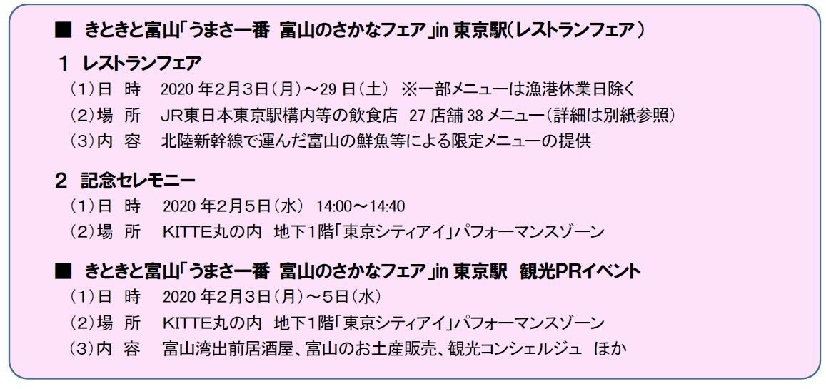 本フェアは、東京駅の商業施設を運営する株式会社鉄道会館との連携により実施するもので、富山の鮮魚を使った特別メニューなどを提供します。また特別メニューによく合う、富山のきれいな水と米で作られた芳醇で味わい深い日本酒の提供も予定しています。
