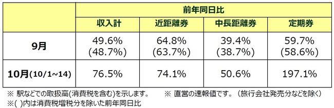 なお、北陸新幹線は10月14日までで、51%となっていますが、昨年の台風19号の影響で運転を取りやめていたため、その反動増です。