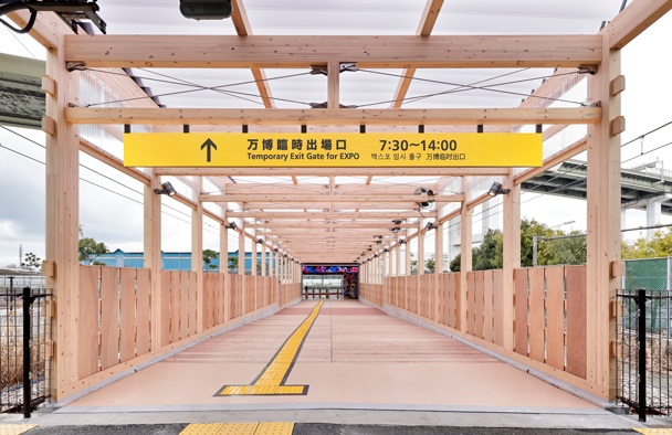 大阪・関西万博関連プロジェクトのうち、桜島駅改良工事を担当しています。万博期間限定の仮改札口では、ホームから仮駅舎へと続く木造の連絡通路をはじめ環境配慮の新たな取り組みを行っております。万博会場へ向かわれるお客様が安全に楽しんで桜島駅をご利用いただけるよう、引き続き関係者一丸となって工事を進めてまいります。