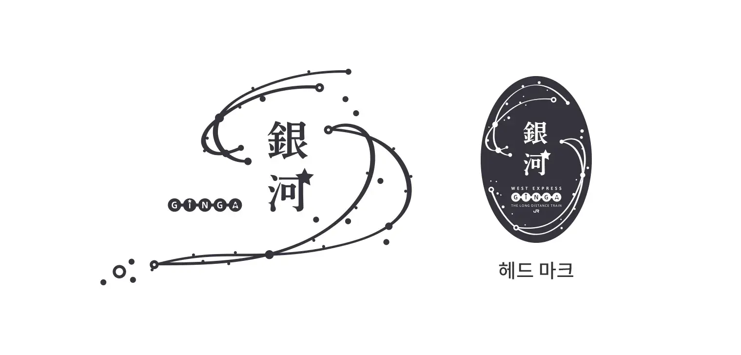 서일본 지역의 매력적인 명소를 별에 비유하고 그 별들 사이로 열차가 이동하는 모습을 곡선으로 디자인함으로써 'WEST EXPRESS 은하'가 매력적인 지역과 고객을 연결하는 열차라는 의미를 담았습니다.